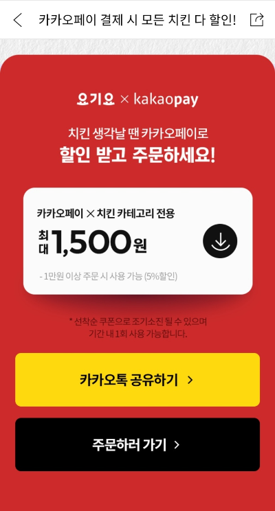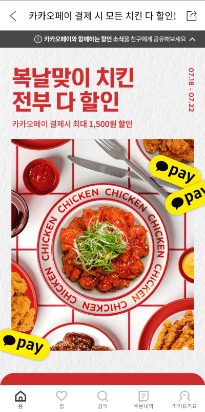 이번주는 복날맞이 치킨 전부다 할인(카카오페이 결제시, 1만이상 5%할인 최대 1,500원)도 있고